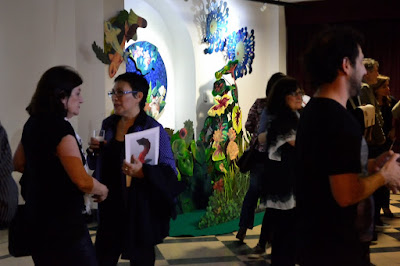 Lo que observa Alicia Nakatsuka es un paisaje íntimo y cuidado. Nos propone un rincón —propio de esos patios pequeños de casas de pasillo— con plantas y flores de pétalos multicolores, caladas en madera y dispuestas sobre islotes de paño de modo escenográfico. Luciana Astuto, en cambio, presenta su obra en trípticos alargados con serigrafías llenas de líneas y contornos de color que remiten al paisaje oriental, aunque reduciendo drásticamente el contenido informativo de eso que quiere mostrar y que se observa. La mirada de Alejandro Krapacher propone un juego de relaciones con el paisaje. No importa tanto la imagen que utiliza sino cómo lo hace. Simplemente la imprime en una lámina adhesiva, con transparencia, sobre un gran ventanal vidriado que da a la calle. Elije una fotografía que tomó en el campo de su familia cuando era niño, en la que intenta esbozar una biografía sobre su infancia rural y su vida adulta en la ciudad. Este ejercicio convierte al ventanal en un soporte que posibilita otro diálogo existente entre dos espacios: el de la propia sala de exposiciones (que puede pensarse en los límites que proponen cuatro paredes) y el que lo trasciende y lo vincula con el afuera, con el paisaje arquitectónico, con un contexto que es extra-artístico y que se re-contextualiza a partir de un juego dialéctico con el entorno, ocultando y des-ocultando el espacio en relación a la obra. Y si es el espacio el que se disimula, será la obra la que se pondrá en evidencia para traer al mundo una nueva mirada sobre el paisaje.